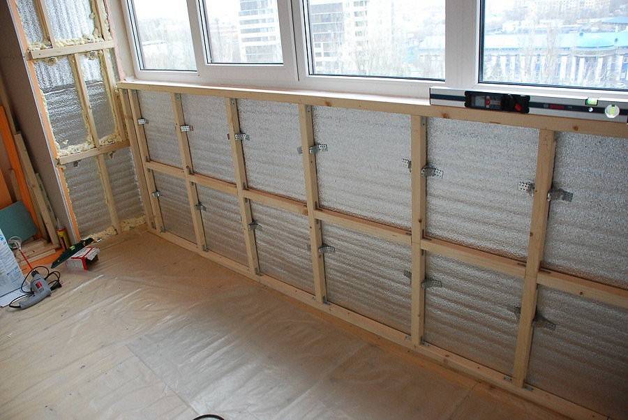 - На потолке и стенах устроить обрешетку под пенофол, чтобы получился карман из воздуха в 2 см высотой. На полу уложить обрешетку на лаги, при этом высота лагов не должна превышать 4 см. Лаги крепятся при помощи шурупами (можно болтами). В зависимости от конструкции балкона можно использовать и другие методы крепления деревянных деталей на бетон.