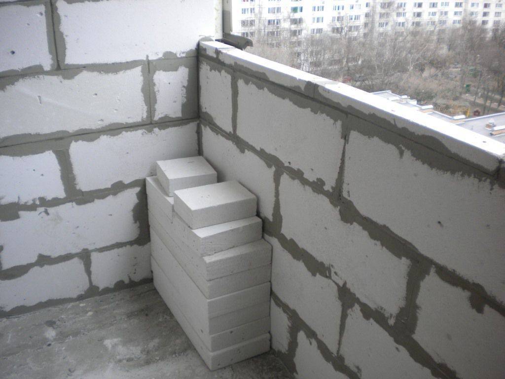При возведении парапета из пеноблоков обратите внимание на состояние основания и всей конструкции лоджии. Помните о том, что вес стеклопакетов весьма значителен, и вместе с кладкой из блоков масса балкона может стать критической