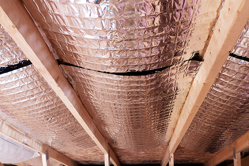 Распространенная ошибка при утеплении деревянного потолка изолоном изнутри заключается в том, что полосы материала укладывают с нахлестом. Этого делать нельзя, потому что между двумя прослойками без воздушного зазора образуется конденсат. Полосы фольгированного теплоизолятора укладываются только стык в стык. Все швы обязательно проклеиваются армированным скотчем. Вместо него можно использовать силиконовый герметик.