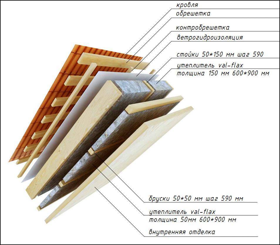 На схеме показан вариант с двойным утеплением. Первый слой утеплителя заложен между стропилами, второй – между брусками обрешетки. Такое расположение слоев дает более эффективное утепление, чем просто увеличенный слой одинарного теплоизолятора, что связано с наличием воздушной прослойки.