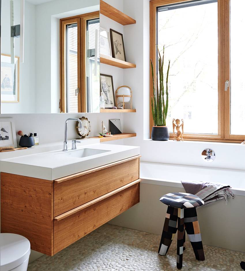 Светлое или темное дерево присутствует в виде мебельного наполнения, а камень используется для отделки. Такие детали «оживляют» ванную комнату и ломают стереотип о «стерильности» дизайна.