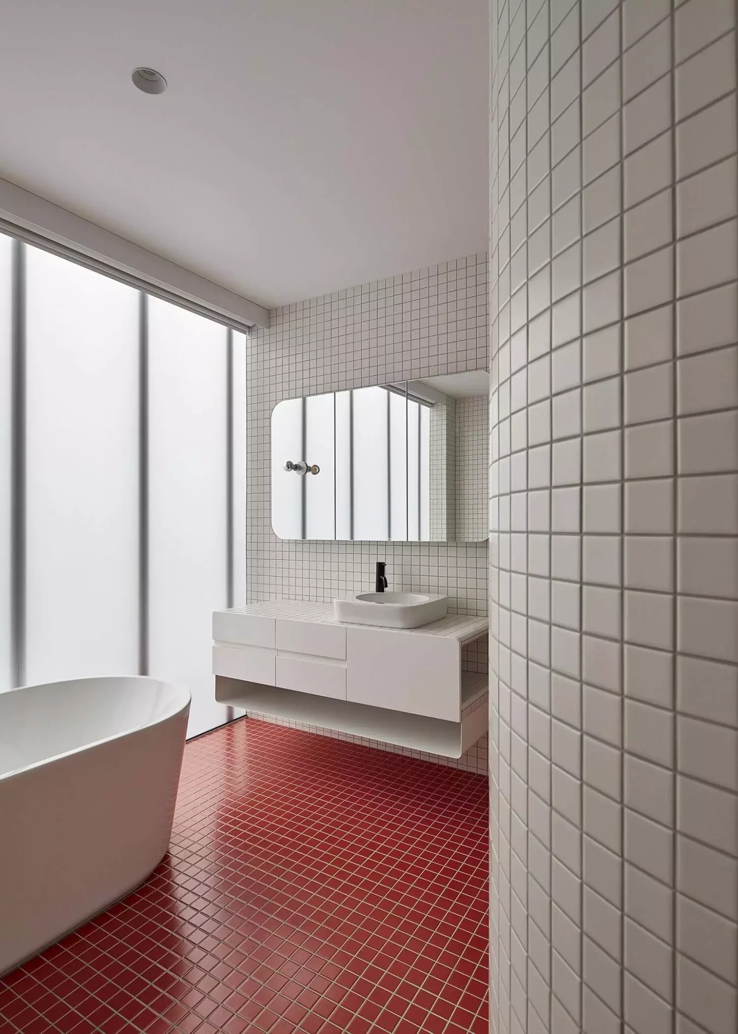 Ванная комната также украшена терракотовой плиткой, чтобы согреть атмосферу. Это один из модных цветов 2023 года. Он прекрасно гармонирует с очень естественными оттенками, такими как бежевый, минеральный серый, белый. Древесина и матовая отделка идеально подходят для этого типа цвета, который также очень естественен.