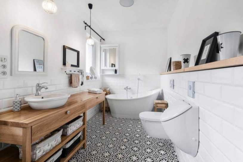 Также обратите внимание на пористость; вам понадобится более непроницаемая плитка для пола из-за воздействия воды. Винил будет лучше, чем керамическая плитка, и это один из самых популярных вариантов напольного покрытия, поскольку он недорогой и практичный (безопасный, простой в установке и обслуживании). Если бюджет позволяет, то вся плитка для ванной, может быть интересным способом объединить долговечность и стиль