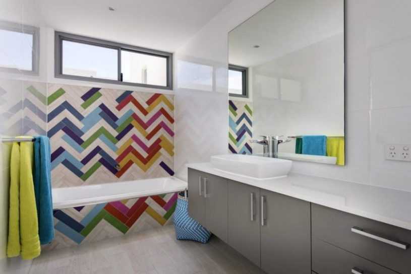Основа для стильного декорирования ванной комнаты – оригинально уложенная плитка в сочетании с разнообразными аксессуарами. Свежо смотрится чередование ритма укладки, например спокойная равномерность, внезапно сменяющаяся яркой, контрастной зоной. Эффектно смотрятся крупные панно на акцентной стене в сочетании с однотонным оформлением остальных