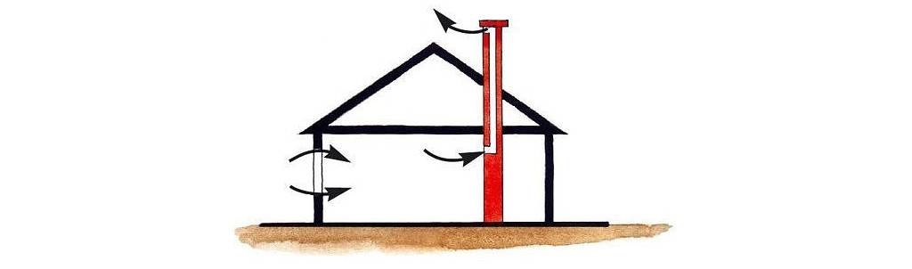 Естественная вентиляция (иногда ее называют гравитационной) функционирует благодаря этой тяге. Вертикальный вентиляционный канал нижним концом выводится в вентилируемое помещение, а верхний — поднимается над крышей.