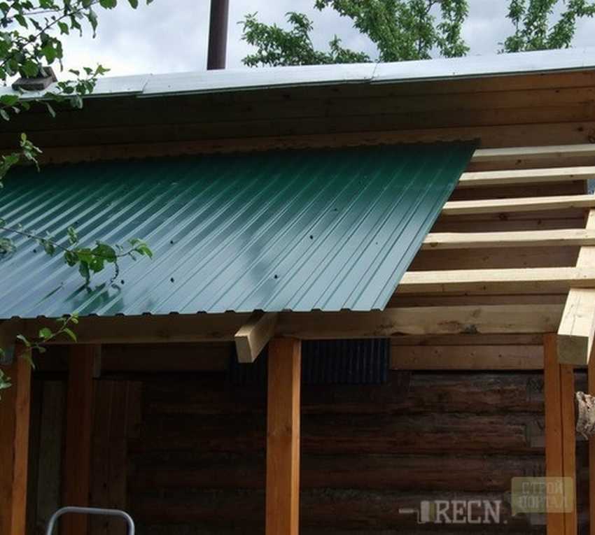 Установка стропильной системы верандыВ зависимости от выбранного материала набивают обрешетку (для металлочерепицы, ондулина, шифера) или делают сплошную обрешетку (для гибких кровельных материалов).
