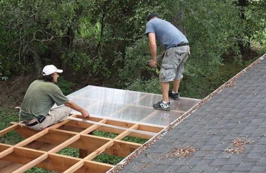 Лучше сочетается дерево с поликарбонатом. Его плюс еще в том, что его установить можете сами: сделать рамы с вынутой четвертью, в них установить листы поликарбоната на герметик. К раме они крепятся саморезами со специальными термошайбами, которые компенсируют разное температурное расширение. Швы между листами заполняются прозрачным герметиком, но есть специальные монтажные профиля для стыковки листов.