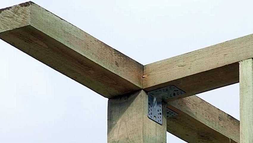 - Прикрепите стойки к обвязке саморезами и усильте стальными уголками.