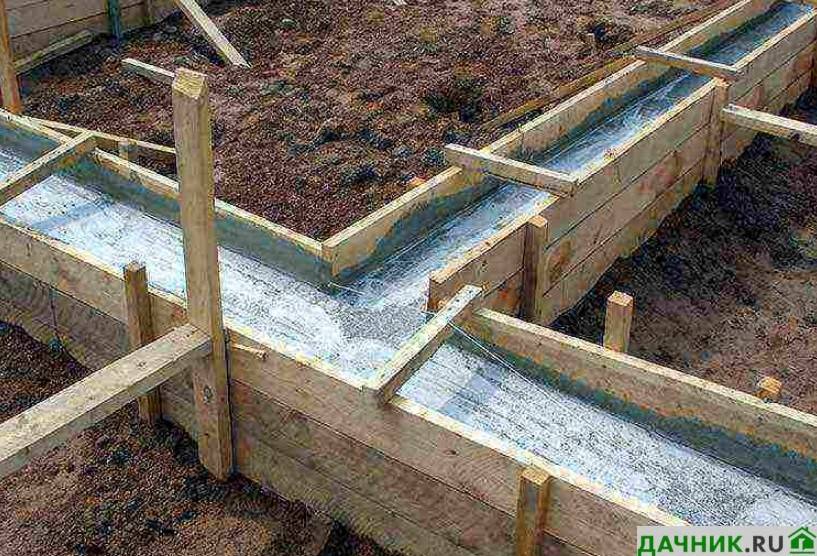 - После заливки 2-го слоя устанавливается опалубка из древесины для возведения надземной части ленточного основания (цокольной части). Гидроизоляционный материал запускается внутрь опалубки и фиксируется к её стенкам;