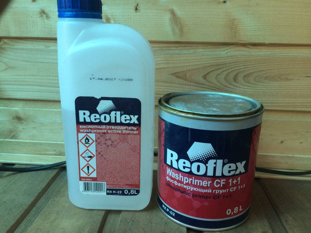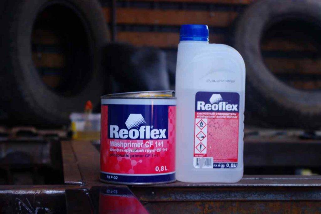 Это вош-праймер (wash-primer) для нанесения на «голый» кузов автомобиля. В компонент входят поливиниловые смолы, а катализатором выступает ортофосфорная кислота. Благодаря такому составу формируется прочная пленка, устойчивая к коррозии и растворению. Реактивный грунт наносят тонким слоем (9-10 мкр). Он проникает в металл и способствует его пассивации.