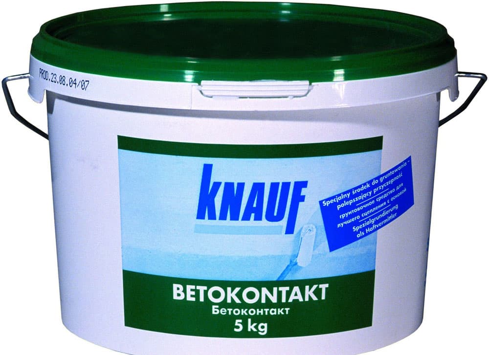 - Бетоноконтакт – адгезионный с акриловым связующим. Улучшает прикрепление декоративного покрытия к гладким невпитывающим материалам как бетон, плитка кафельная. Содержит кварцевый песок, цемент
