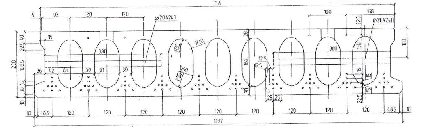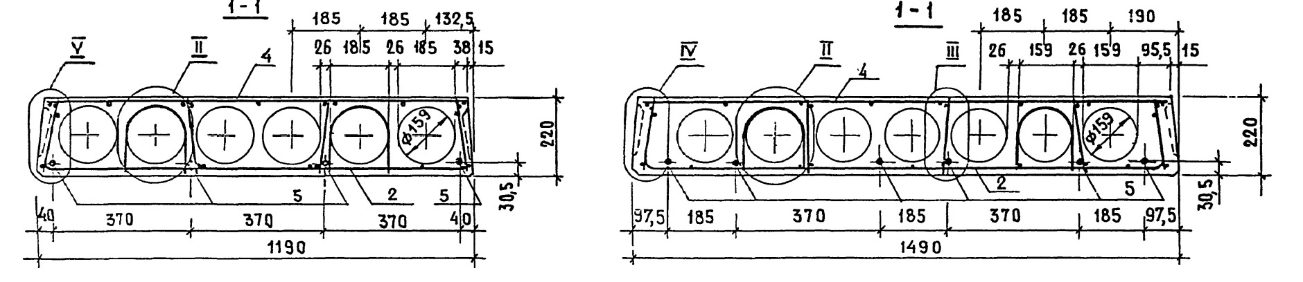 - 4ПК: толщина бетонирования – 260 мм, круглые пустотные отверстия Ø 159 мм, вырезы по верхней границе, опираются на 2 стороны;