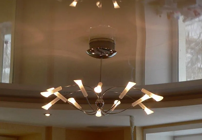 Такие осветительные приборы крепятся к специальному крюку на подвесе, установленном на черновой (базовый) потолок. Большая часть конструкции прячется под отделочными материалами и скрыта от глаз человека, тем самым не портя внешний вид. Обязательно, чтобы плафоны и рожки были направлены вниз от потолка. Это исключает нагрев мембраны и формирование бликов, которые могут образоваться на глянцевом покрытии потолка.