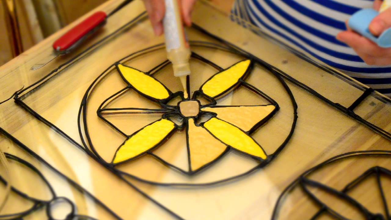 Заливной витраж делают из лакокрасочных материалов, но предпочтение отдают прозрачным лакам. Для создания такого рисунка сначала прорисовывают специальной пастой контур каждой детали. После чего пространство внутри контура заполняют (заливают) лаком нужного цвета.