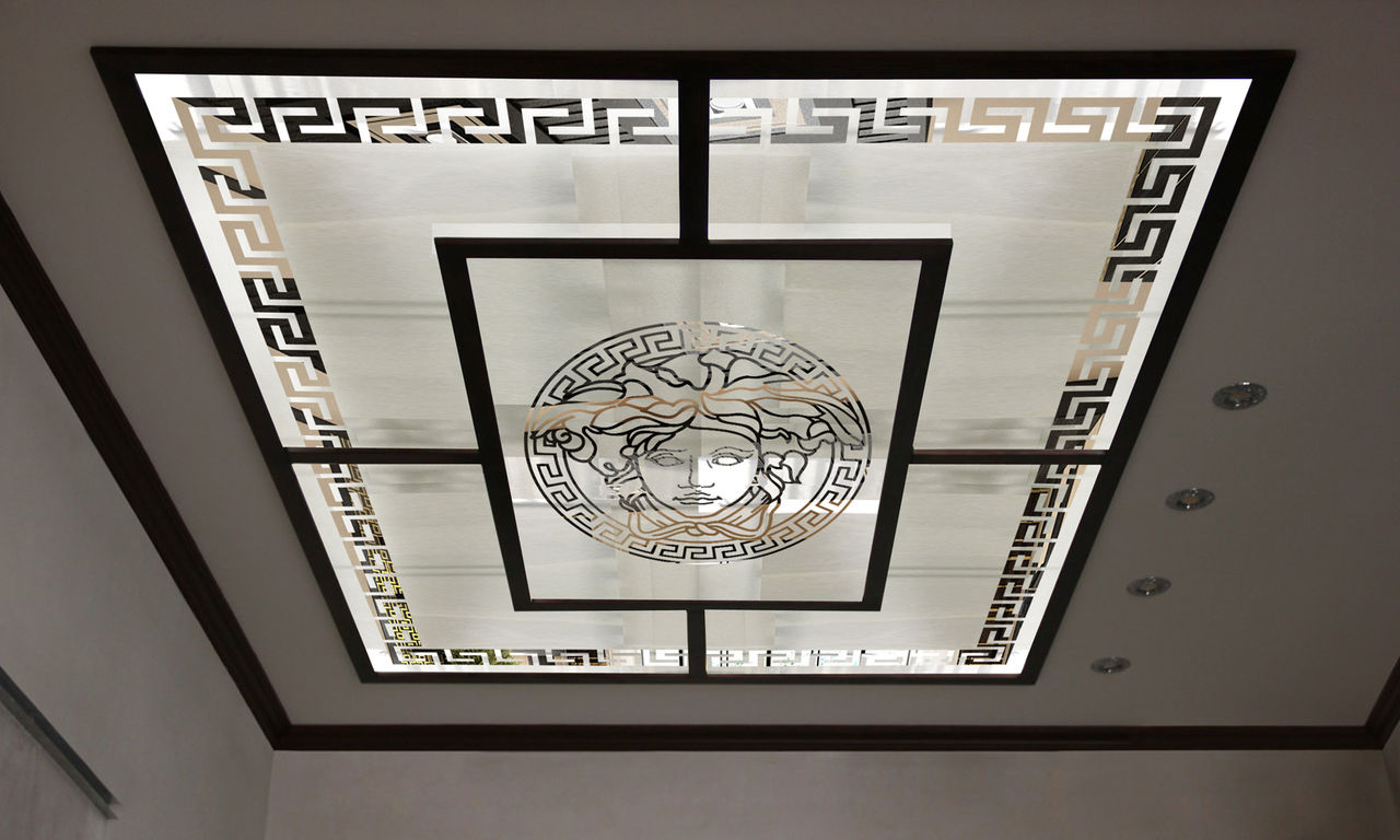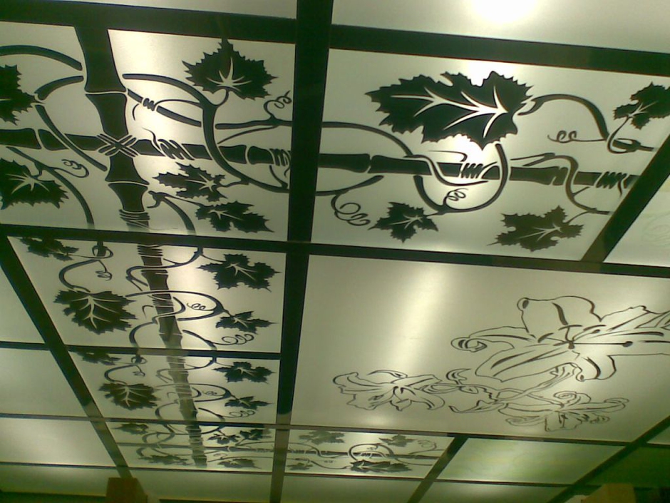 Плиты выполняют роль дизайнерского элемента. Они представляют собой пластины квадратной формы с изображением элементов орнамента или общего рисунка. Подвесная система конструкции состоит из: