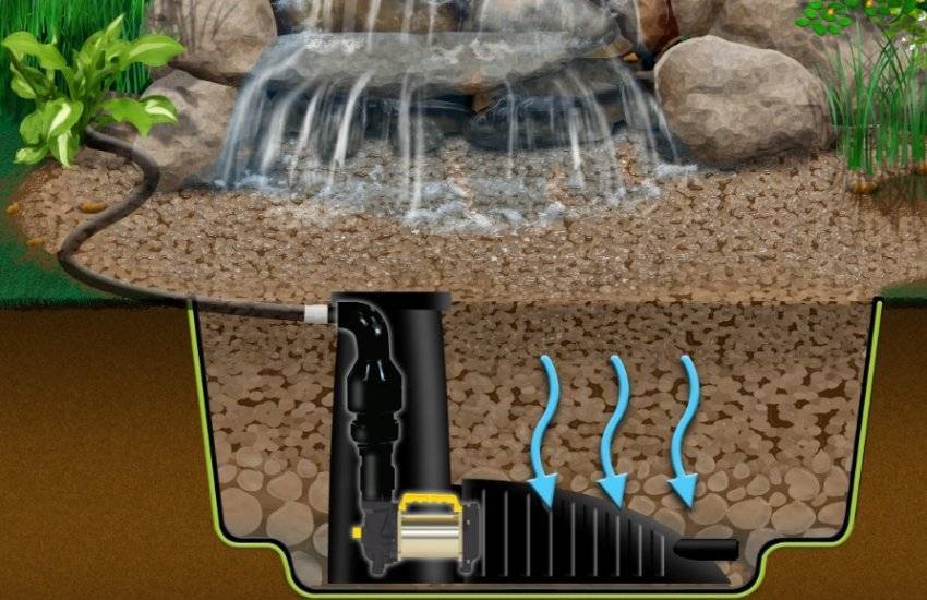 - Водозаборную. В нее поступает льющаяся с водопада вода, а насосы снова подают ее вверх. Насос, как правило, находится в чаше пруда.