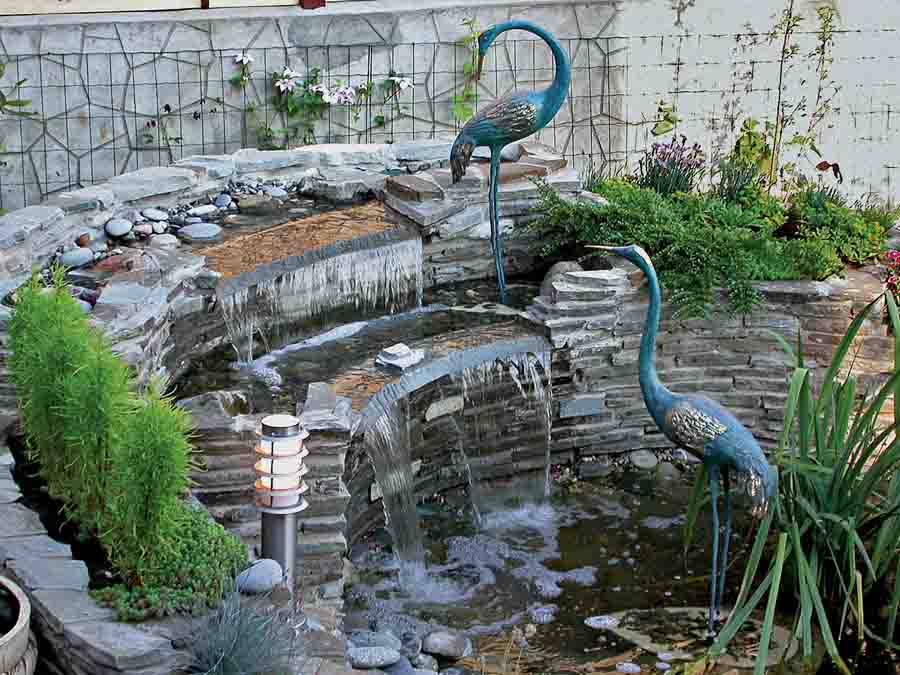 Несколько водоемов или чаш устанавливаются так, чтобы поток воды переливался из верхней в нижнюю, а вода из нижней перекачивалась в самую верхнюю. Таким образом создается впечатление небольшого водопада.