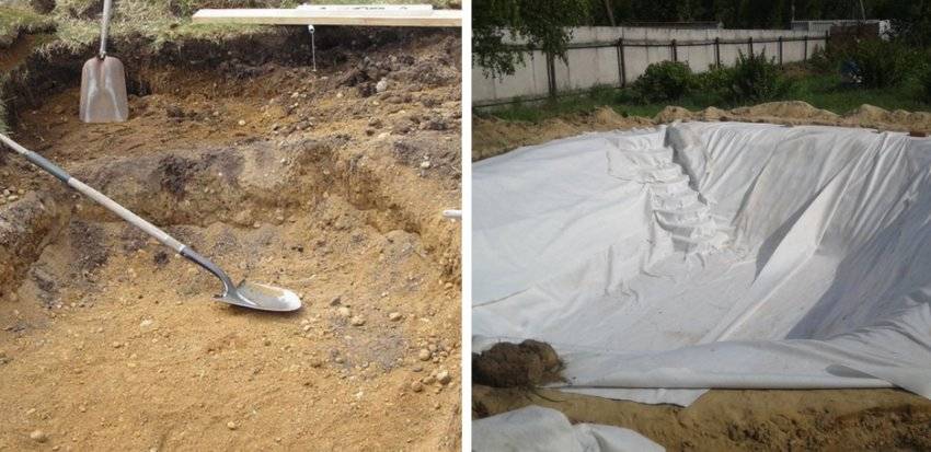 При создании углубления можно работать ручным инструментом или нанять экскаватор — всё зависит от масштаба деятельности. Сначала делают террасы от 30 до 50 см шириной и до 30 см глубиной, а потом основную яму. Угол сечения от земной поверхности до дна должен составлять 45°. Глубина зависит от высоты купленной формы, если ёмкость не используется — от желания хозяина.