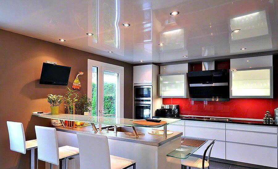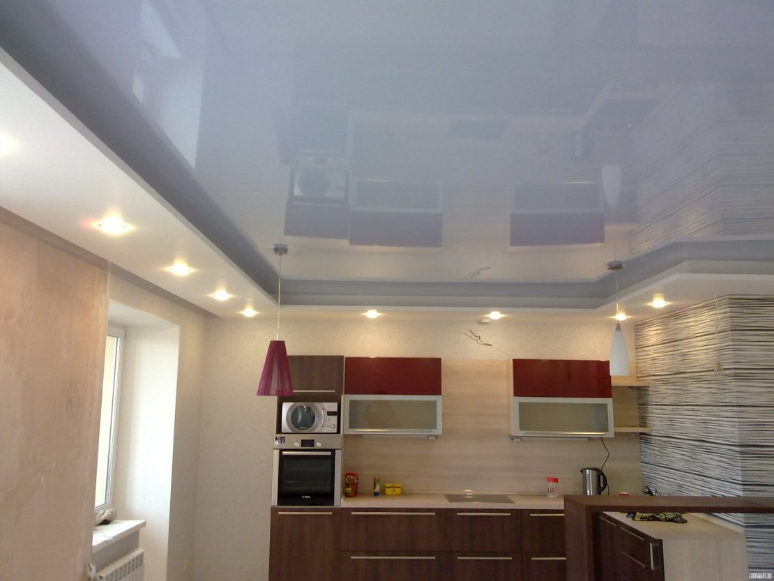 Также ПВХ-потолок стоит выбрать, исходя из того, что кухня и санузел — это одни из самых грязных комнат в квартире. Ухаживать за пленкой намного проще, чем за тканевым полотном.