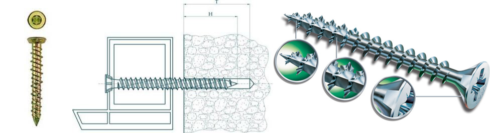 Дюбель-саморез для бетона выполняется с переменной резьбой, вкручивающейся прямо в монолит. Сначала, как обычно, сверлят отверстие меньшего диаметра, потом закручивают нагель, в процессе чего переменная насечка расширяет полость, а резьба фиксирует саморез.
