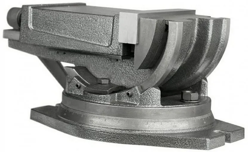 - Для обработки деталей в вертикальном положении выбираются модернизированные слесарные тиски. Их основание вращается на 360°. Чаще оснащены увеличенной наковальней.