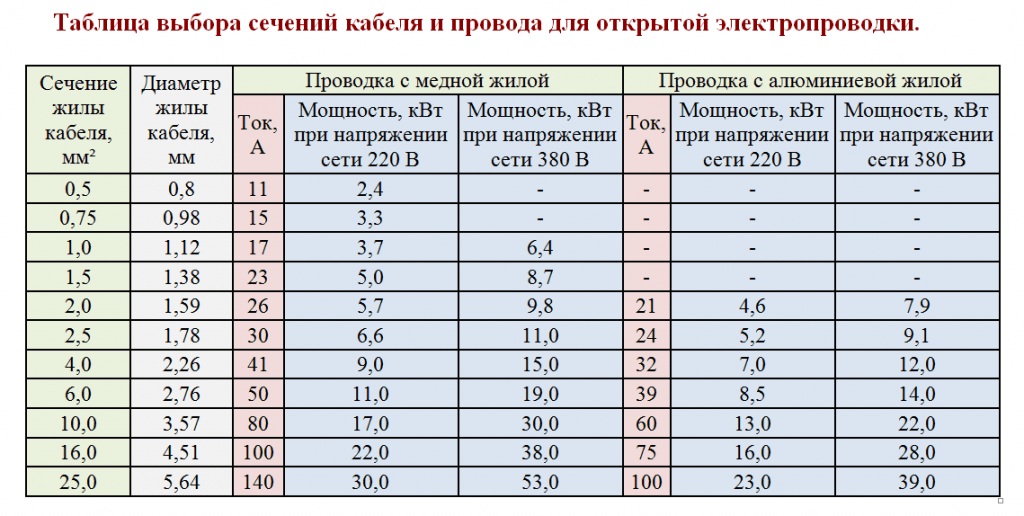 Таблица выбора сечения алюминиевого кабеля по току и мощности