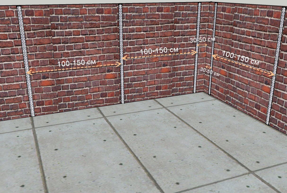 - Далее нужно немного поработать с профилями. Маячок нужно правильно разместить, а значит, на стене отметить вертикальные, горизонтальные нижние и верхние границы. С помощью правила выдержать расстояние между маяками, которое не должно превышать 165 см. Отступив от уровня пола 20 см, следует начертить горизонтальную линию. Проделать в стене отверстия в местах пересечения вертикальных и горизонтальных линий. Вставить дюбеля.