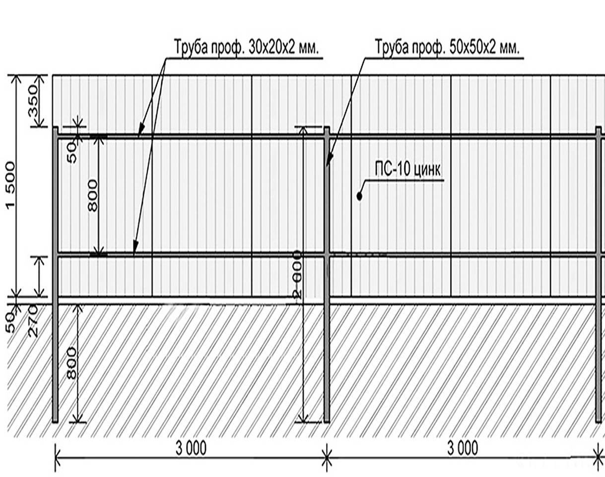 Расстояние между опорами зависит от веса профнастила. Для стандартного листа С-10 высотой два метра шаг установки столбов – от 2,5 до 3 метра.