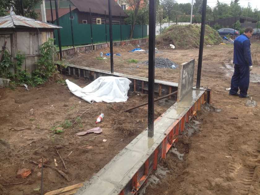 Используют бетон марок М150 или М200.Затем заливают бетон, прокалывают прутком – чтобы вышли пузыри воздуха. Проверяют вертикальность столбов, если нужно – подправляют, пока бетон жидкий. Поверхность фундамента нужно закрыть пленкой и первые дни регулярно увлажнять.