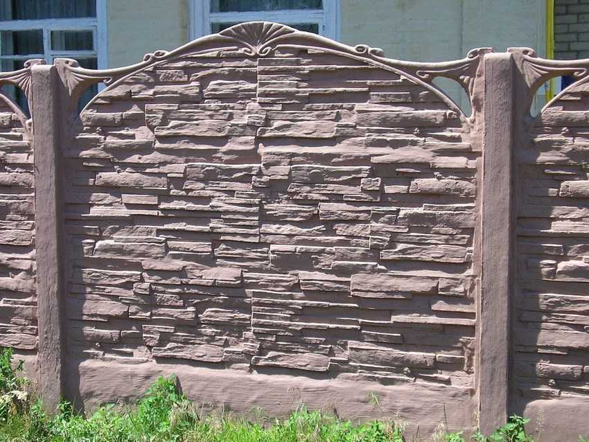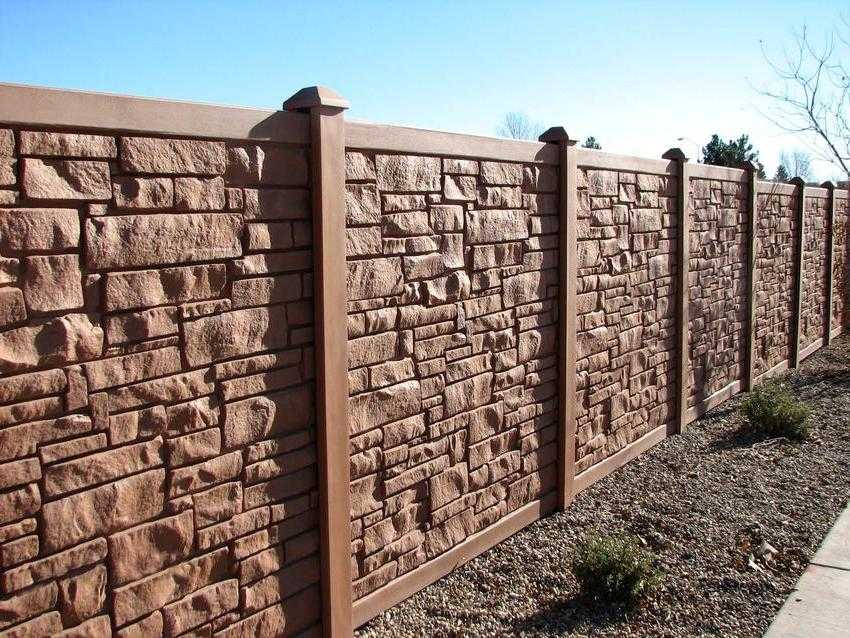 Забор из бетонных панелей с имитацией камня, покрытый краской.
