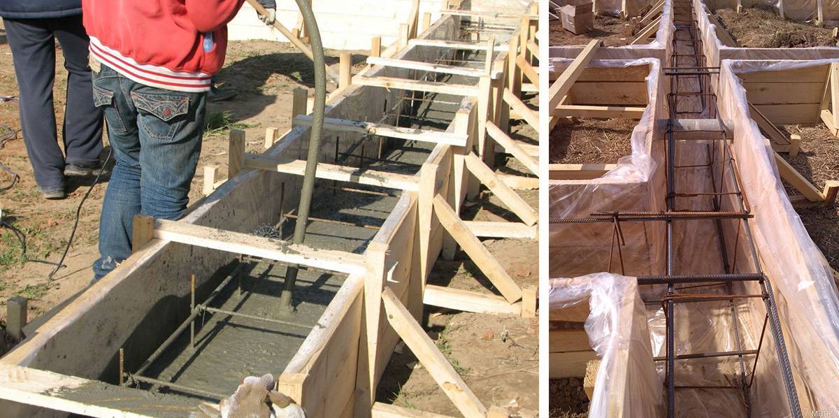 В вырытой траншее делаются лунки для столбов с шагом 1,5-2 м. После завершения армирования основания, в лунки вставляют подготовленные столбы и закрепляют к армирующему поясу сваркой. Верхнюю часть столбов связывают лагами. Все эти операции необходимо выполнить до заливки бетоном, которая выполняется обычным способом.
