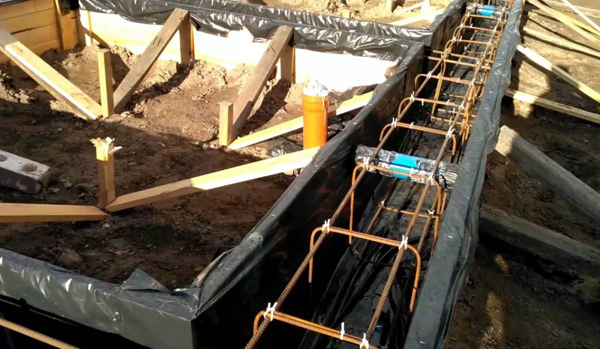 После сборки фундамента внешняя поверхность несущего основания обрабатывается гидроизоляционными материалами. Наиболее часто используется битумная мастика и специальные битумные мембраны, которые имеют самоклеящуюся основу.