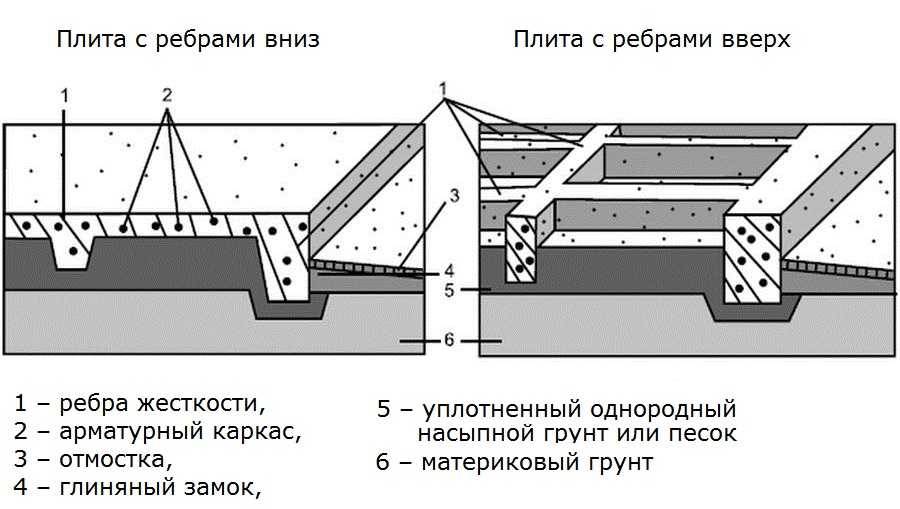 - Русский — плита с ребрами жесткости. Для усиления конструкции под тяжелые дома и в тяжелых условиях эксплуатации (сильное морозное пучение) русские ученые придумали делать более массивные ребра жесткости. Их устраивают, как правило, под несущими стенами. Сложность работ при этом возрастает — отдельно устраиваются ребра жесткости, отдельно — плита. Но несущая способность такого фундамента значительно выше, что позволяет уменьшить толщину плиты — до 10-15 см.