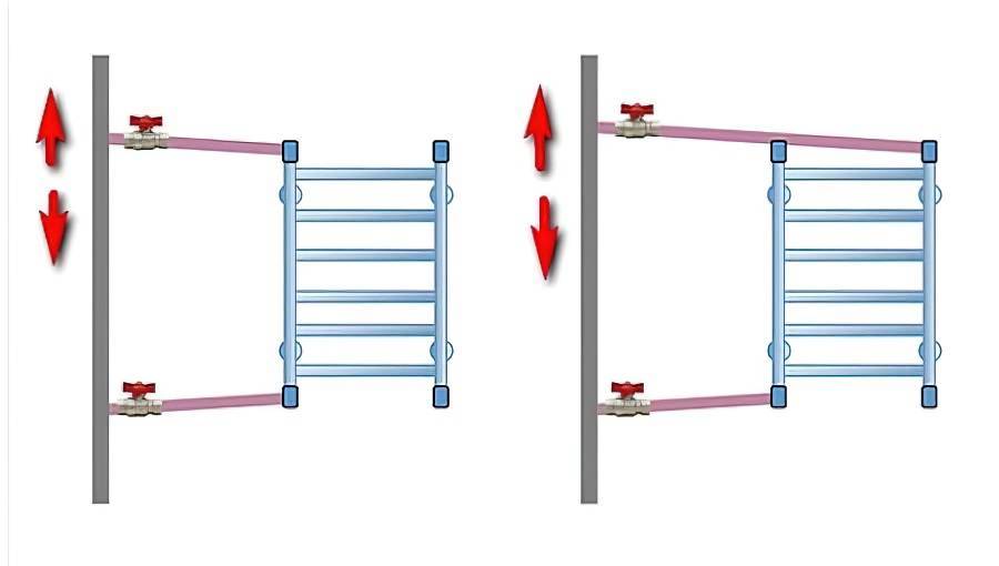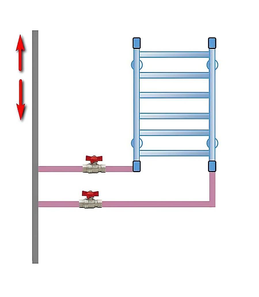 Допускаются некоторые отступления от правил. Схема, где верхний отвод располагается ниже врезной точки полотенцесушителя, рабочая при достаточном давлении в сети. Однако здесь образуется воздушная пробка. Поэтому после отключения нужно стравливать воздух.