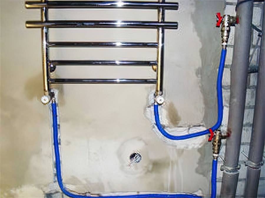 - Трубы, которые соединяют отводы с полотенцесушителем, обязаны быть прямыми: не иметь «горбов», провоцирующих постепенное скапливание воздуха — пробку, перекроющую со временем циркуляцию воды. Если есть возможность, то пластиковые подводы, которые запланировано спрятать в стены, лучше укрыть теплоизоляционным материалом.