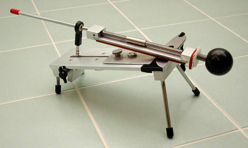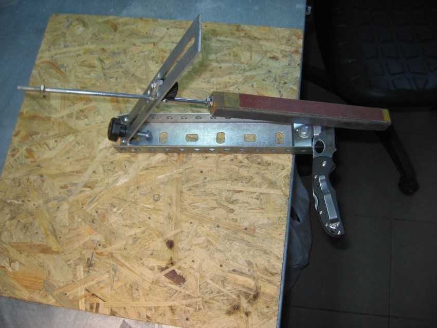 Устройство представляет собой опорный стол, на котором закрепляется нож. На противоположном конце стола вертикально закреплена винтовая стойка с планкой. В эту планку вставляется направляющий стержень, на котором монтируется абразивный брусок. Методом передвижения планки по винтовому стержню можно изменить величину угла обработки металла.